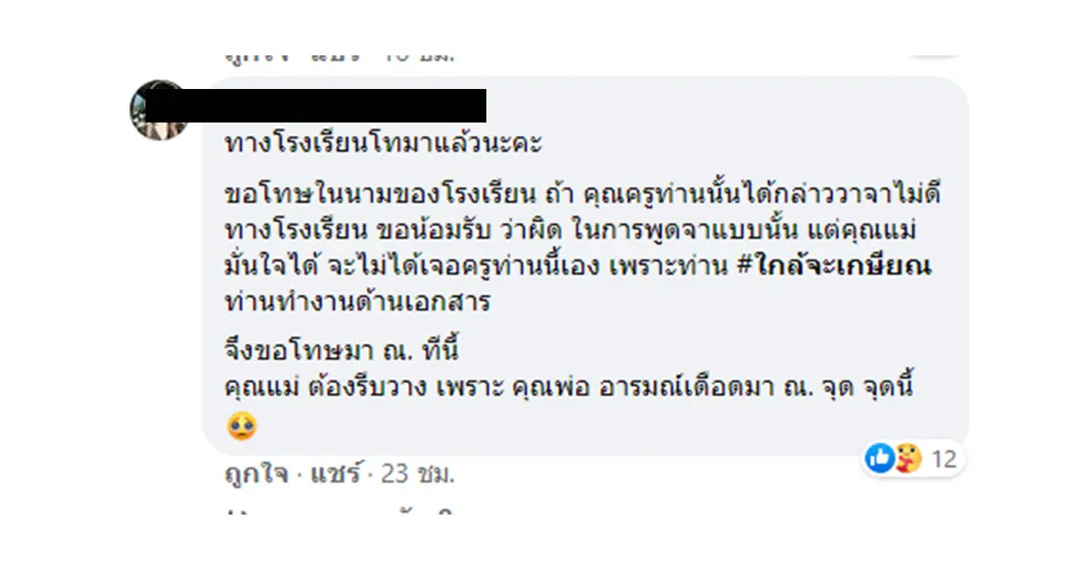 โดยล่าสุดทางโรงเรียนได้ออกมาขอโทษแล้ว และยังกล่าวอีกว่าในทำนองที่ว่าอย่าถือสาเพราะอาจารย์คนดังกล่าวอายุเยอะแล้วกำลังจะเกษียณอายุ
