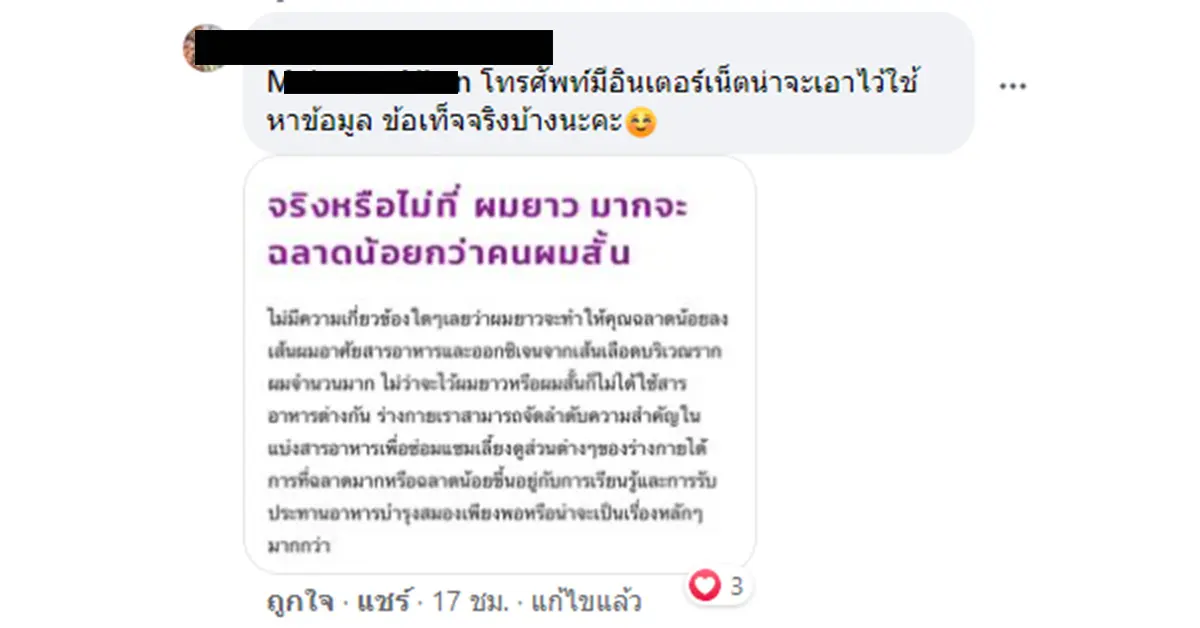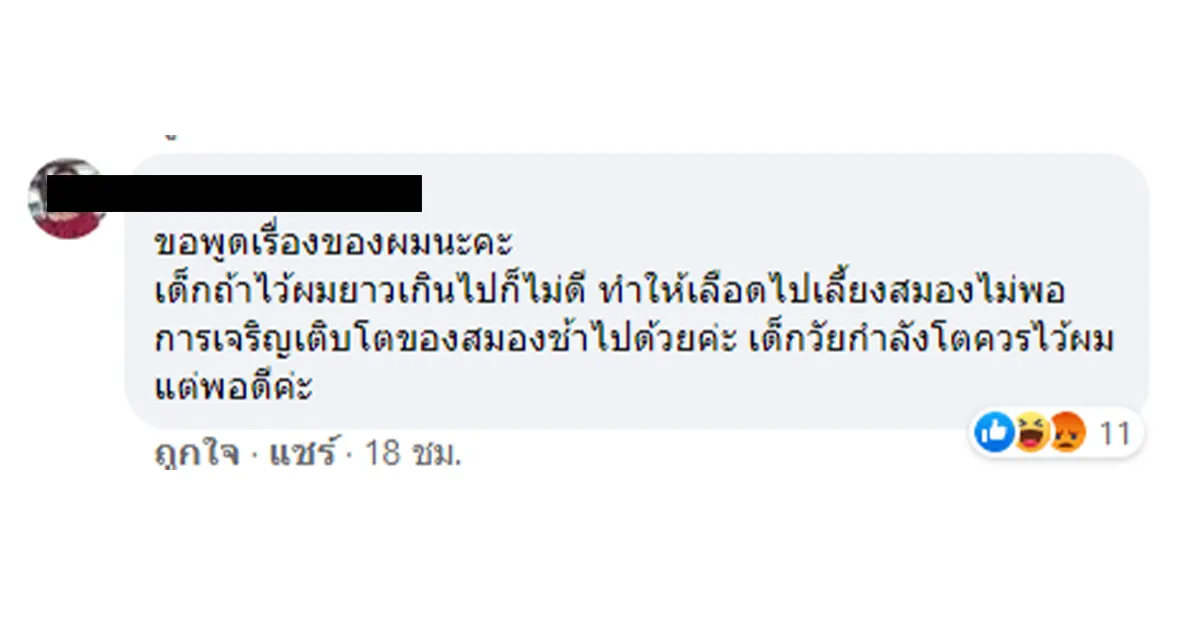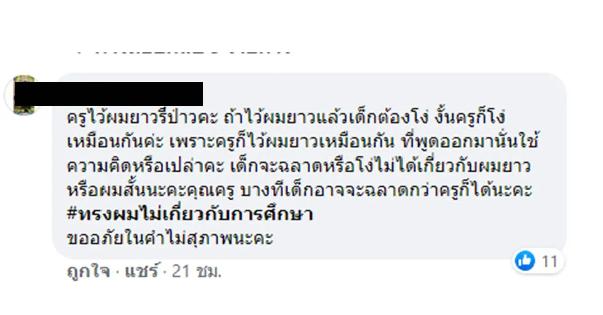 ผมยาวแล้วจะโง่ ผู้ใช้เฟซบุ๊รายหนึ่งได้แชร์เรื่องราวการพาลูกไปสมัครเรียนและถูกคุณครูต่อว่าด้วยถ้อยคำตักเตือนที่ไม่เหมาะสมและย้อนแย้งกับสังคมไทยในเรื่องการเคารพสิทธิผู้อื่น ที่เป็นข้อถกเถียงกันในปัจจุบันซึ่งก็คือการไว้ผมยาว โดยคุณแม่รายนี้ได้โพสต์ลงในกลุ่ม