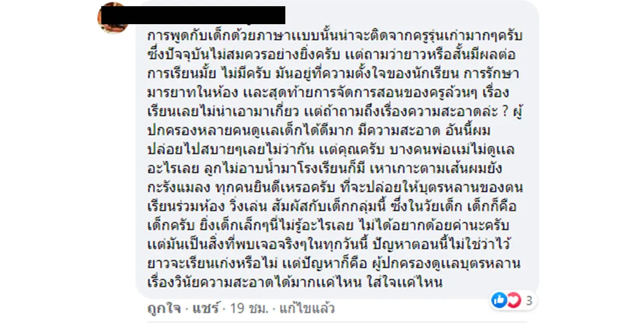 คือ เป็นถึงคุณครู จำเป็น ต้องพูดขนาดนี้เลยหรอคะ ไม่อยากมีปัญหา เพราะลูกเราต้องอยู่กับเค้า กลัวถ้ามีเรื่องไปแล้วลูกต้องอยู่ห้องเค้า แล้วลูกเราจะโดนรังแก