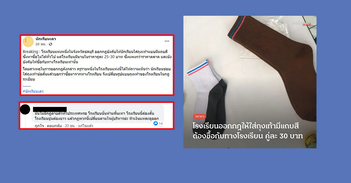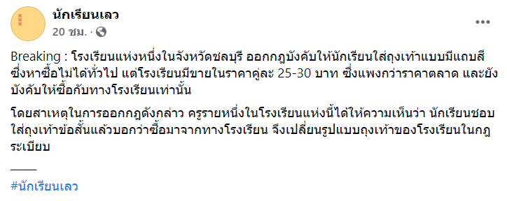 Breaking : โรงเรียนแห่งหนึ่งในจังหวัดชลบุรี ออกกฎบังคับให้นักเรียนใส่ถุงเท้าแบบมีแถบสี ซึ่งหาซื้อไม่ได้ทั่วไป แต่โรงเรียนมีขายในราคาคู่ละ 25-30 บาท ซึ่งแพงกว่าราคาตลาด และยังบังคับให้ซื้อกับทางโรงเรียนเท่านั้นโดยสาเหตุในการออกกฎดังกล่าว ครูรายหนึ่งในโรงเรียนแห่งนี้ได้ให้ความเห็นว่า นักเรียนชอบใส่ถุงเท้าข้อสั้นแล้วบอกว่าซื้อมาจากทางโรงเรียน จึงเปลี่ยนรูปแบบถุงเท้าของโรงเรียนในกฎระเบียบ