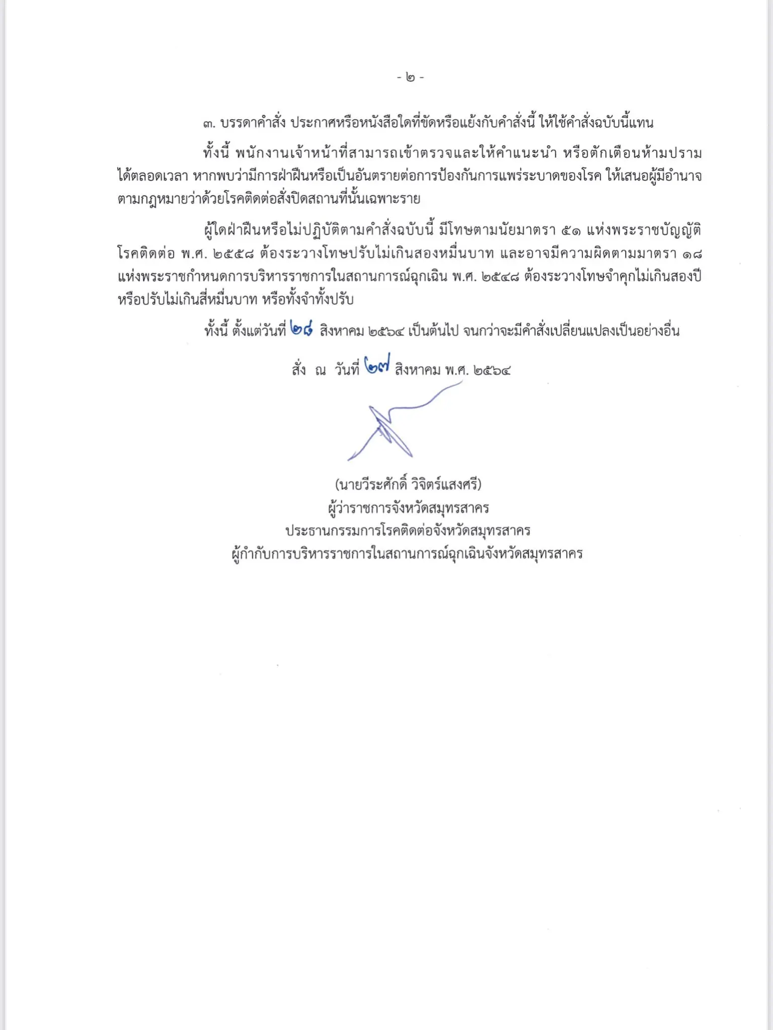 ทั้งนี้ พนักงานเจ้าหน้าที่สามารถเข้าตรวจและให้คำแนะนำ หรือตักเตือนห้ามปรามได้ตลอดเวลา หากพบว่ามีการฝ่าฝืนหรือเป็นอันตรายต่อการป้องกันการแพร่ระบาดของโรค ให้เสนอผู้มีอำนาจตามกฎหมายว่าด้วยโรคติดต่อสั่งปิดสถานที่นั้นเฉพาะรายตั้งแต่ 28 ส.ค. 64 เป็นต้นไป จนกว่าจะมีคำสั่งเปลี่ยนแปลงเป็นอย่างอื่น