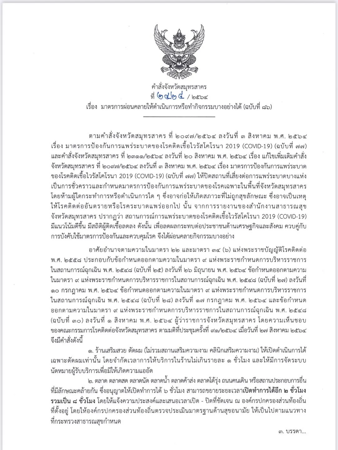 ผู้ว่าราชการจังหวัด สมุทรสาคร ผ่อนคลายมาตรการ ร้านทำผม (ยกเว้นคลินิกความงาม) ตลาดสด ตลาดนัด ถนนคนเดิน เปิดได้แล้ววันนี้