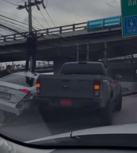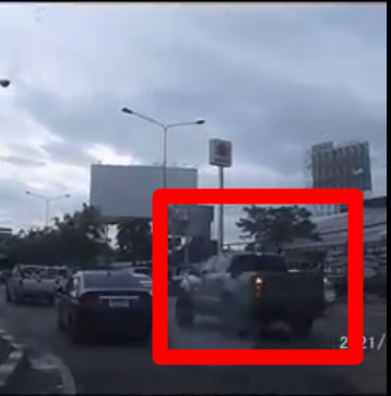 โดยก่อนหน้าได้มีอีกคลิปเหตุการณ์หนึ่ง รถคันสีขาวพยายามขับรถหนีกระบะป้ายแดงที่กำลังไล่ตามอยู่ โดยฝั่งกระบะถือมีดโชว์ให้เห็นชัดๆ พอมาถึงจุดเกิดเหตุ รถกระบะก็เบียดอัดรถสีขาวติดกับข้างทาง ทำให้ไปต่อไม่ได้ ประชาชนผู้ใช้รถใช้ถนนที่สัญจรผ่านไปมาก็สงสัยว่า มันเกิดเหตุอะไรขึ้น ทำไมรถกระบะถึงยอมเอารถป้ายแดงไปแลกเพื่อหยุดอีกฝ่ายให้ได้ โดยมีการตั้งข้อสังเกตว่าอาจเป็นเหตุการณ์ตำรวจไล่จับผู้ร้าย โดยใช้รถป้ายแดงแทรกซึม