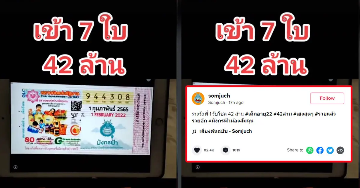 เช่นเดียวกับผู้โชคดีรายนี้ ที่ถูกรางวัลที่1 ในงวดวันที่ 1 กุมภาพันธ์ 2565 แต่ครั่งนี้ถูกใบเดียว มันดูธรรมดาไป เพราะถูกรางวัลที่ 1 ทั้งหมด 7 ใบ ตีเป็นเงินรางวัลกว่า 42 ล้าน โดยทางด้านของผู้ใช้ติ๊กต็อก somjuch โพสต์คลิปเมื่อวันที่ 1 กุมภาพันธ์ 2565 ที่ผ่านมา พร้อมโชว์ สลากกินแบ่งรัฐบาล งวดวันที่ 1 กุมภาพันธ์ 2565 ที่ตรงกับรางวัลที่ 1 ทั้งหมด 7 ใบ โดยเผยว่า “รางวัลที่1 เข้ามังกรฟ้า7ใบ รับโชคไปคนเดียว 42 ล้าน” อีกทั้งแคปชั่นคลิปดังกล่าวระบุว่า “รางวัลที่ 1 รับโชค 42 ล้าน #เด็กอายุ22 #42ล้าน #เฮงสุดๆ #รวยแล้วรวยอีก #มังกรฟ้าน้องส้มฉุน”