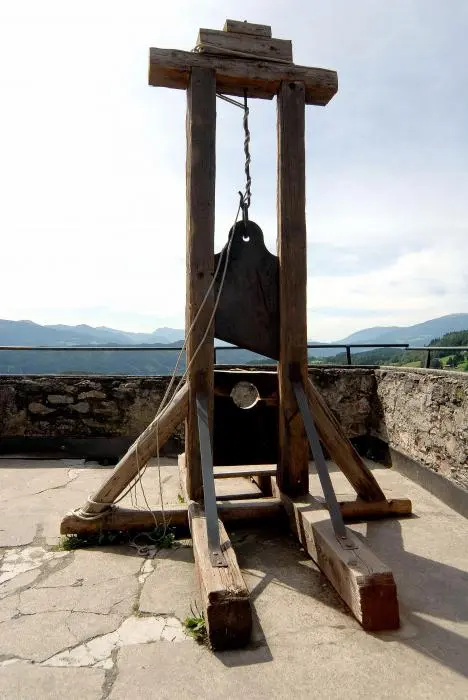 1) กิโยติน ถูกสร้างขึ้นเอง เป็นเสาไม้ตั้งสูงสองเสา มีใบมีดใหญ่กว้าง 4 นิ้ว ยาว 1 เมตรอยู่ตรงกลาง มีถังทรายถ่วงน้ำหนักอยู่สองด้าน มีเชือกดึงไว้เปิดกลไกให้ใบมีดตกลงมา