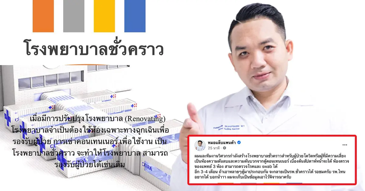 แนวคิดดีๆ จากหนุ่มไฟแรง “หมอแล็บแพนด้า” และทีมวิศวะกร มุ่งสร้าง โรงพยาบาลชั่วคราว สำหรับผู้ป่วยโควิด เดินหน้าช่วยเหลือเต็มกำลัง