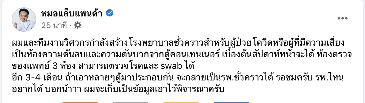 ล่าสุดหมอแล็บแพนด้า มากับแผนงานใหม่ครั้งใหญ่อีกครั้ง เมื่อเขาโพสต์ลงแฟนเพจของเขา เกี่ยวกับโรงพยาบาลชั่วคราวที่และทีมวิศวะกรกำลังดำเนินการจัดทำอยู่ อีกทั้งยังบอกอีกว่า หากโรงพยาบาลไหนต้องการ สามารถบอกได้ จะรับไว้พิจารณา