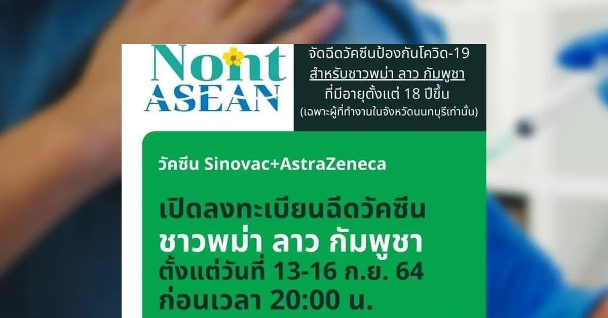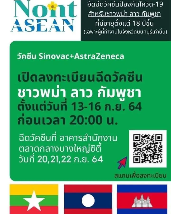 สำนักงานสาธารณสุขจังหวัดนนทบุรี เร่งปูพรมฉีดวัคซีนโควิด ออกประกาศแจ้งพี่น้องชาวแรงงานต่างชาติ เปิด “ นนท์ ASEAN ” จัดฉีดวัคซีนสำหรับชาว พม่า ลาว กัมพูชา ที่มีอายุตั้งแต่ 18 ปีขึ้นไป (เฉพาะผู้ที่ทำงานในจังหวัดนนทบุรีเท่านั้น) ให้มาลงทะเบียนฉีดวัคซีน โดยวัคซีนที่ใชจะเป็นวัคซีนไขว้ (Sinovac เข็มที่ 1 และ วัคซีน AstraZeneca เข็มที่ 2)