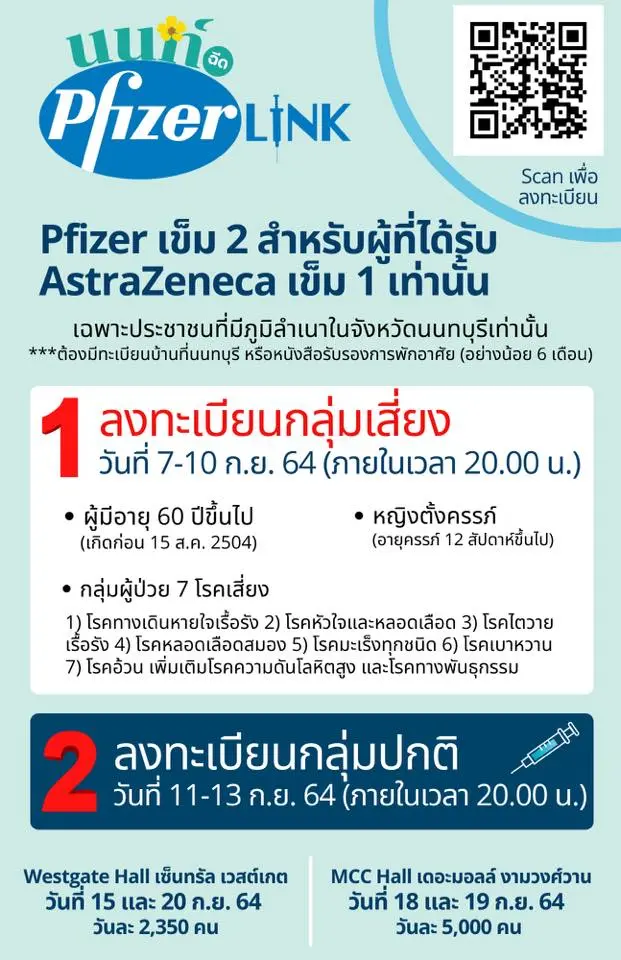 สำนักงานสาธารณสุขจังหวัดนนทบุรี ได้โพสต์เฟซบุ๊กเชิญชวนประชาชน เข้ารวมจอง นนท์ Pfizer Link โดยจะเปิดลงทะเบียนวัคซีน Pfizer สำหรับฉีดเป็นเข็ม 2 ให้ผู้ที่ได้รับวัคซีน AstraZeneca เข็ม 1 เท่านั้น (โปรดอ่านเงื่อนไขโดยละเอียด)