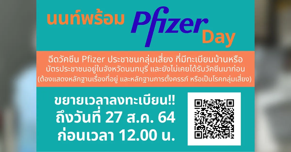 ล่าสุด ‘นนท์พร้อม Pfizer Day’ ได้ขยายระยะเวลาในการลงทะเบียน ถึงวันพรุ่งนี้ (27 ส.ค.) ก่อนเวลา 12.00 น. โดยสามารถลงทะเบียนได้ที่ www.นนท์พร้อม.com