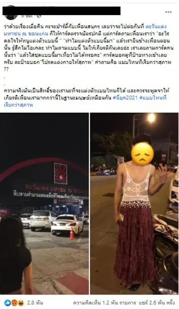 ว่าด้วยเรื่องเมื่อคืน กะจะปาร์ตี้กับเพื่อนสนุกๆ เลยว่าจะไปต่อกันที่ ตะวันแดง มหาซน ณ ขอนแก่น ก็ให้การ์ดตรวจบัตรปกติ แต่การ์ดถามเพื่อนเราว่า “อะไรดลใจให้หนูแต่งตัวแบบนี้ “ “ทำไมแต่งตัวแบบนี้มา” แล้วเรายืนข้างเพื่อนตอนนั้น รู้สึกไม่โอเคละ ทำไมถามแบบนี้ ไม่ให้เกียรติกันเลยอ่ะ เราเลยถามการ์ดคนนั้นว่า “แล้วใส่ชุดแบบนี้มาเที่ยวไม่ได้หรอคะ” การ์ดบอกดูที่ป้ายทางเข้าเลยครับ ละป้ายบอก”โปรดแต่งกายให้สุภาพ” คำถามคือ แบบไหนที่เรียกว่าสุภาพ ??..ความจริงมันเป็นสิทธิ์ของเรานะที่จะแต่งตัวแบบไหนก็ได้ และควรจะพูดจาให้เกียรติเพื่อนเรามากกว่านี้ในฐานะมนุษย์เหมือนกัน #นี่ยุค2021#แบบไหนที่เรียกว่าสุภาพ
