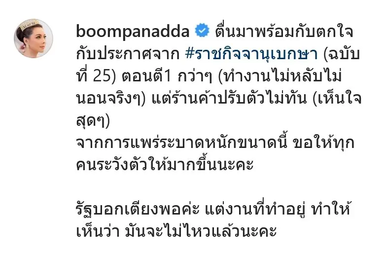 “ตื่นมาพร้อมกับตกใจกับประกาศจาก #ราชกิจจานุเบกษา (ฉบับที่ 25) ตอนตี1 กว่าๆ (ทำงานไม่หลับไม่นอนจริงๆ) แต่ร้านค้าปรับตัวไม่ทัน (เห็นใจสุดๆ) จากการแพร่ระบาดหนักขนาดนี้ ขอให้ทุกคนระวังตัวให้มากขึ้นนะคะ”