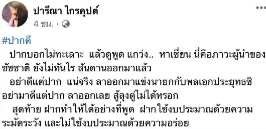 ที่ได้โพสต์ข้อความผ่านเฟซบุ๊ก ปารีณา ไกรคุปต์ ระบุว่า “#ปากดี ปากบอกไม่ทะเลาะ แล้วดูพูด แกว่ง.. หาเสี้ยน นี่คือภาวะผู้นำของชัชชาติ ยังไม่ทันไร สันดานออกมาแล้วอย่าดีแต่ปาก แน่จริง ลาออกมาแข่งนายกฯ กับพลเอกประยุทธ์ซิ อย่ามาดีแต่ปาก ลาออกเลย สู้ลุงตู่ไม่ได้หรอก สุดท้าย ฝากทำให้ได้อย่างที่พูด ฝากใช้งบประมาณด้วยความระมัดระวัง และไม่ใช้งบประมาณด้วยความอร่อย”