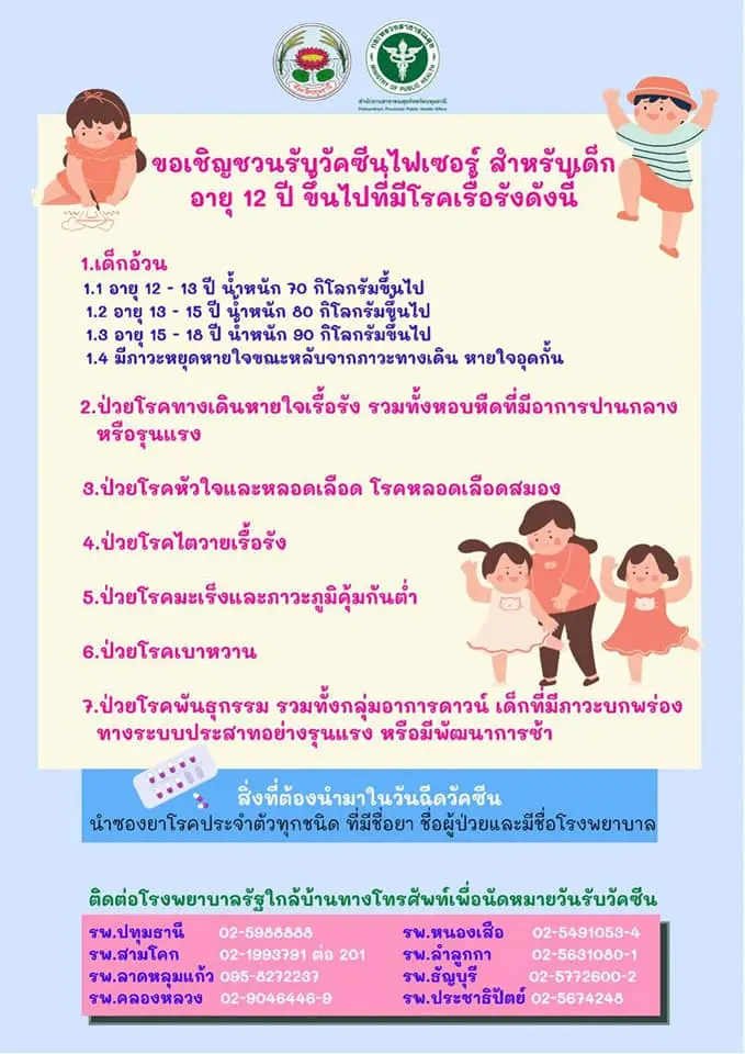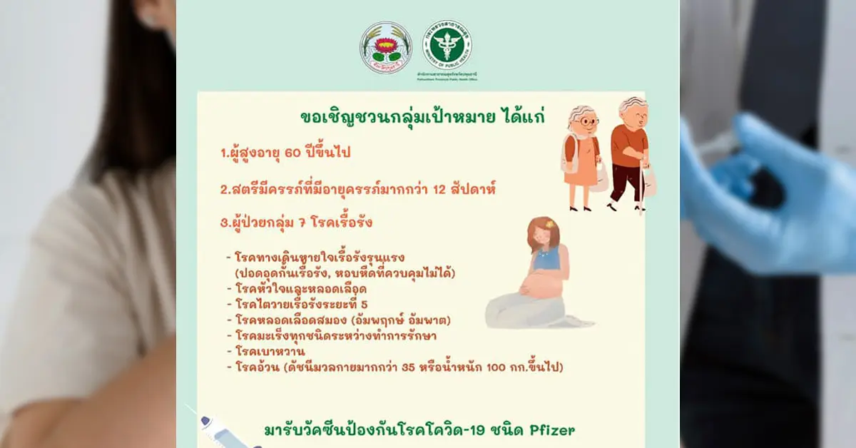 8 โรงพยาบาลใน ปทุมธานี เปิดจองวัคซีนไฟเซอร์ฟรี สำหรับผู้สูงอายุ กลุ่มเสี่ยง เด็กอายุ 12 ที่มีโรคเรื้อรัง และสตรีมีครรภ์