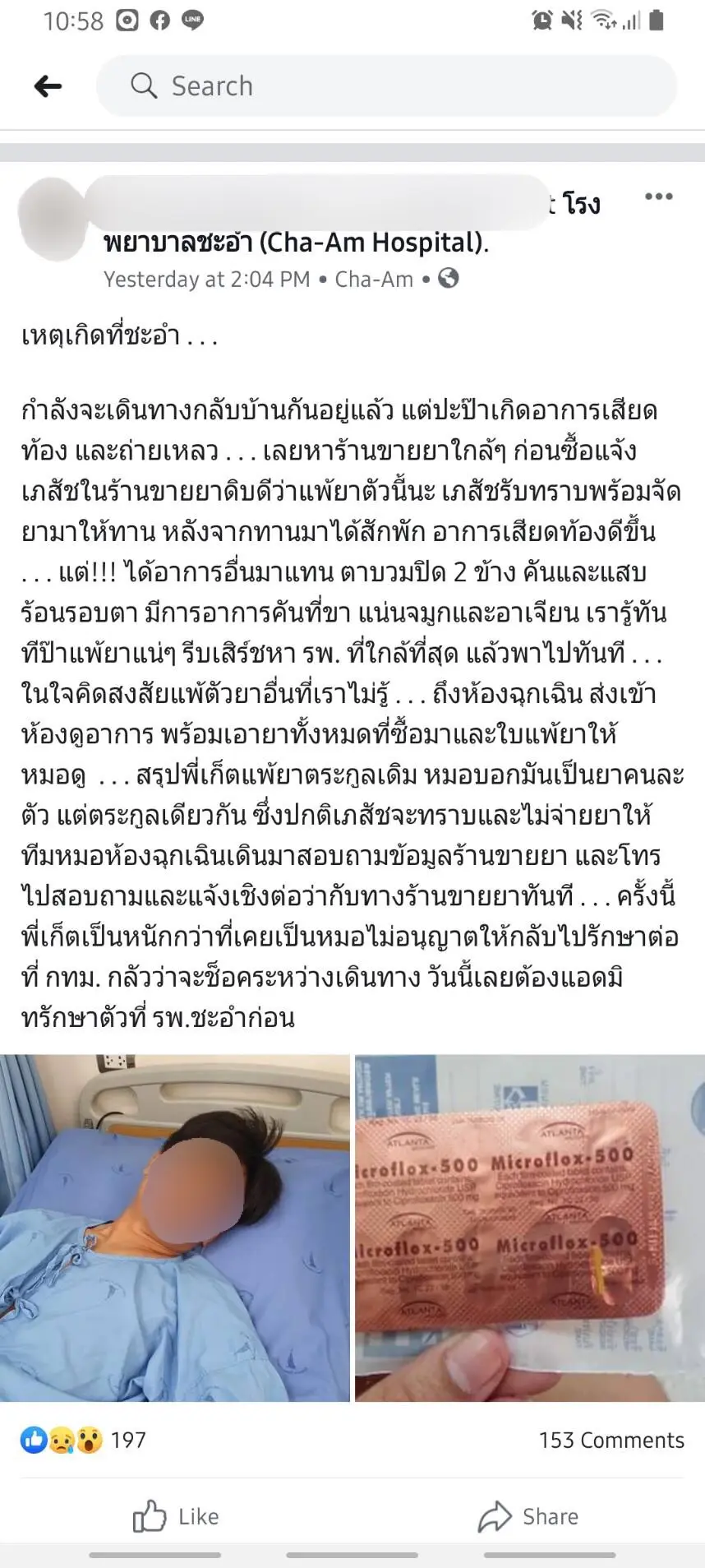 เธอจึงรีบพาสามีเดินทางไปโรงพยาบาล ที่ใกล้ที่สุด และเอายาทั้งหมดที่ซื้อมาและใบแพ้ยาให้แพทย์ดู โดยแพทย์ระบุว่ายาดังกล่าวเป็นตระกูลเดียวกันเพียงแต่คนละยี่ห้อ ทีมแพทย์ห้องฉุกเฉินเดินมาสอบถามข้อมูลร้านขายยา และโทรไปสอบถามและแจ้งเชิงต่อว่ากับทางร้านขายยาทันที ในครั้งนี้แพทย์ไม่อนุญาตให้กลับไปรักษาต่อที่ กทม. กลัวว่าอาจจะช็อคระหว่างเดินทางเลยต้องรักษาตัวที่ โรงพยาบาลชะอำก่อน