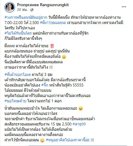 ผู้ใช้เฟซบุ๊ก Pronprawee Rangsunrungkit เผยเรื่องราวสุดลำบากใจที่คนในวงการฟรีแลนซ์ได้เห็นแล้วถึงกับส่ายหัว กับเรื่องราวที่เธอพบเจอการการไหว้วานของรุ่นพี่ให้ช่วยหาตากล้องให้ โดยจะให้เรทราคา 2,500 บาทกับการทำงาน 15 ชั่วโมง หรือตกชั่วโมงละ 170 บาท แน่นอนว่าไม่มีช่างภาพปกติคนไหนรับงานแน่ๆ