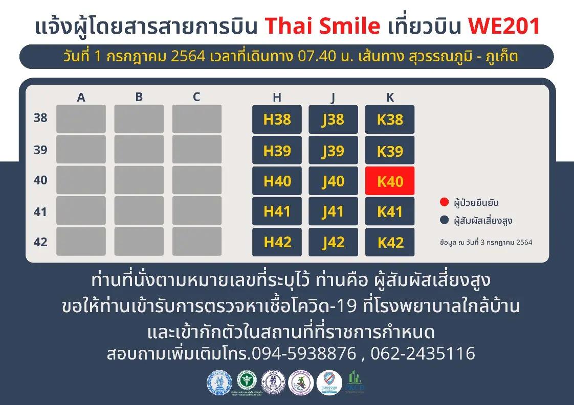 ผู้โดยสารสายการบิน Thai Smile เที่ยวบิน WE201 เดินทาง วันที่ 1 กรกฎาคม 2564 เวลา 07.40 น. เส้นทาง สุวรรณภูมิ – ภูเก็ต โปรดทราบ ท่านที่นั่งตามหมายเลขที่ระบุไว้ ท่านคือ ผู้สัมผัสเสี่ยงสูง ขอให้ท่านเข้ารับการตรวจหาเชื้อโควิด-19 ที่โรงพยาบาลใกล้บ้าน และเข้ากักตัวในสถานที่ที่ราชการกำหนด สอบถามเพิ่มเติม โทร.094-5938876, 062-2435116