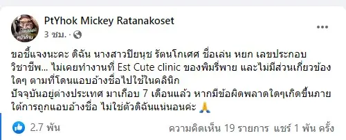 ขอชี้แจงนะคะ ดิฉัน นางสาวปิยนุช รัตนโกเศศ ชื่อเล่น หยก เลขประกอบวิชาชีพ… ไม่เคยทำงานที่ Est Cute clinic ของพิมรี่พาย และไม่มีส่วนเกี่ยวข้องใดๆ ตามที่โดนแอบอ้างชื่อไปใช้ในคลินิกปัจจุบันอยู่ต่างประเทศ มาเกือบ 7 เดือนแล้ว หากมีข้อผิดพลาดใดๆเกิดขึ้นภายใต้การถูกแอบอ้างชื่อ ไม่ใช่ตัวดิฉันแน่นอนค่ะ