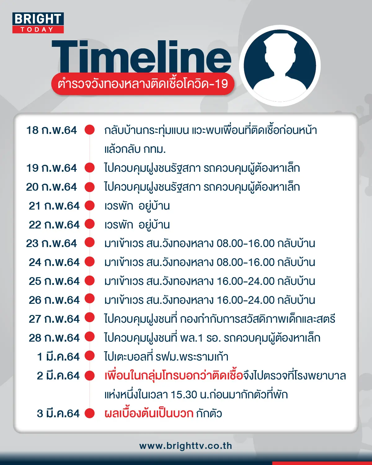 ล่าสุด 4 มี.ค. 64 สน.วังทองหลาง เปิดไทม์ไลน์ตำรวจที่ไปปฎิบัติการควบคุมฝูงชนติดเชื้อโควิด-19 พร้อมระบุว่า ขณะนี้อยู่ระหว่างการตรวจหาเชื้อจากผู้สัมผัสอีกกว่า 50 ราย