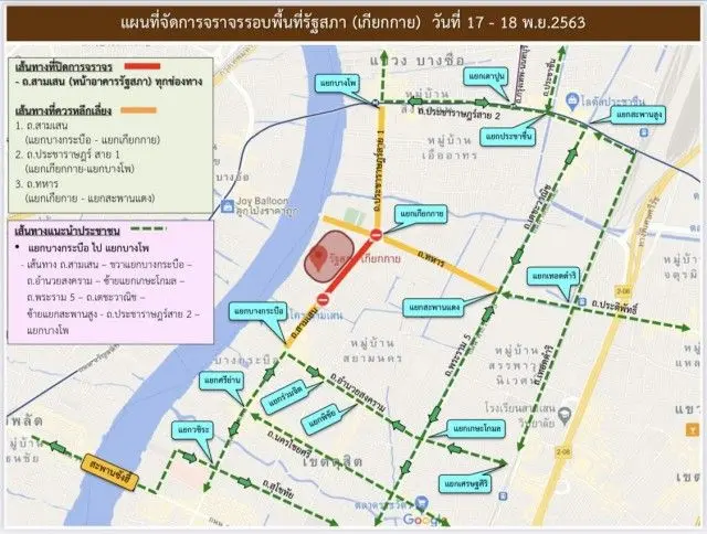 เนื่องด้วยบริเวณการรวมกลุ่มเพื่อชุมนุมฯ อยู่บริเวณถนนสามเสน ซึ่งเป็นเส้นทางสายหลัก และเป็นเส้นทางต่อเนื่องไปยังถนนสายสำคัญหลายสาย ซึ่งประชาชนใช้ในการสัญจร ปริมาณรถที่ใช้ทางจึงมีจำนวนมาก การจราจรหนาแน่นโดยเฉพาะในช่วงเวลาเร่งด่วน เพื่อความสะดวกในการเดินทางของพี่น้องประชาชน จึงขอแจ้งข้อมูลข่าวสารด้านการจราจร โดยขอให้หลีกเลี่ยงเส้นทางตั้งแต่เวลา 06.00 น. ของวันที่ 17 พ.ย.2563 เป็นต้นไปจนเสร็จสิ้นการชุมนุม ดังนี้
