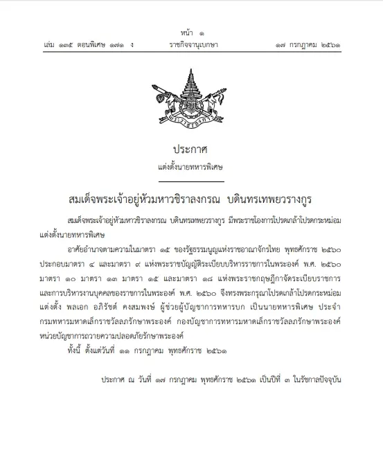 สมเด็จพระเจ้าอยู่หัวมหาวชิราลงกรณ บดินทรเทพยวรางกูร มีพระราชโองการโปรดเกล้าโปรดกระหม่อม แต่งตั้งนายทหารพิเศษอาศัยอำนาจตามความในมาตรา 15 ของรัฐธรรมนูญแห่งราชอาณาจักรไทย พุทธศักราช 2560 ประกอบมาตรา 4 และมาตรา 9 แห่งพระราชบัญญัติระเบียบบริหารราชการในพระองค์ พ.ศ. 2560 มาตรา 10 มาตรา 13 มาตรา 15 และมาตรา 18 แห่งพระราชกฤษฎีกาจัดระเบียบราชการ และการบริหารงานบุคคลของราชการในพระองค์ พ.ศ. 2560 จึงทรงพระกรุณาโปรดเกล้าโปรดกระหม่อม แต่งตั้ง พลเอก อภิรัชต์ คงสมพงษ์ ผู้ช่วยผู้บัญชาการทหารบก เป็นนายทหารพิเศษ ประจำกรมทหารมหาดเล็กราชวัลลภรักษาพระองค์ กองบัญชาการทหารมหาดเล็กราชวัลลภรักษาพระองค์ หน่วยบัญชาการถวายความปลอดภัยรักษาพระองค์ ทั้งนี้ ตั้งแต่วันที่ 11 กรกฎาคม พุทธศักราช 2561 ประกาศ ณ วันที่ 17 กรกฎาคม พุทธศักราช 2561 เป็นปีที่ 3 ในรัชกาลปัจจุบัน