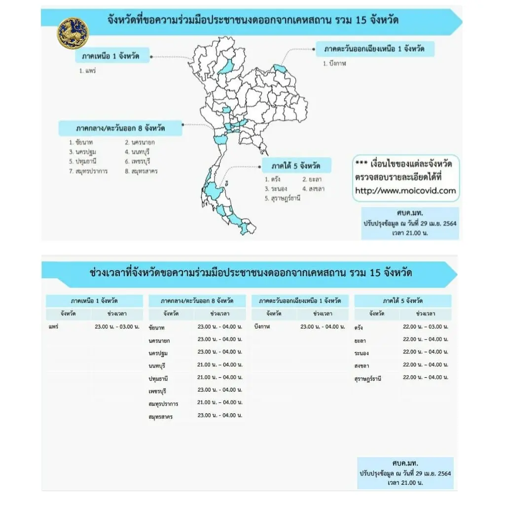 งดออกจากบ้าน — เฟสบุ๊กเพจ กระทรวงมหาดไทย PR ได้แจ้งรายชื่อจังหวัดที่ขอความร่วมมือประชาชนงดออกจากเคหสถาน อัพเดตข้อมูลล่าสุด 29 เมษายน 2564 เวลา 21.00 น. รวมทั้งสิ้น 15 จังหวัด ดังนี้