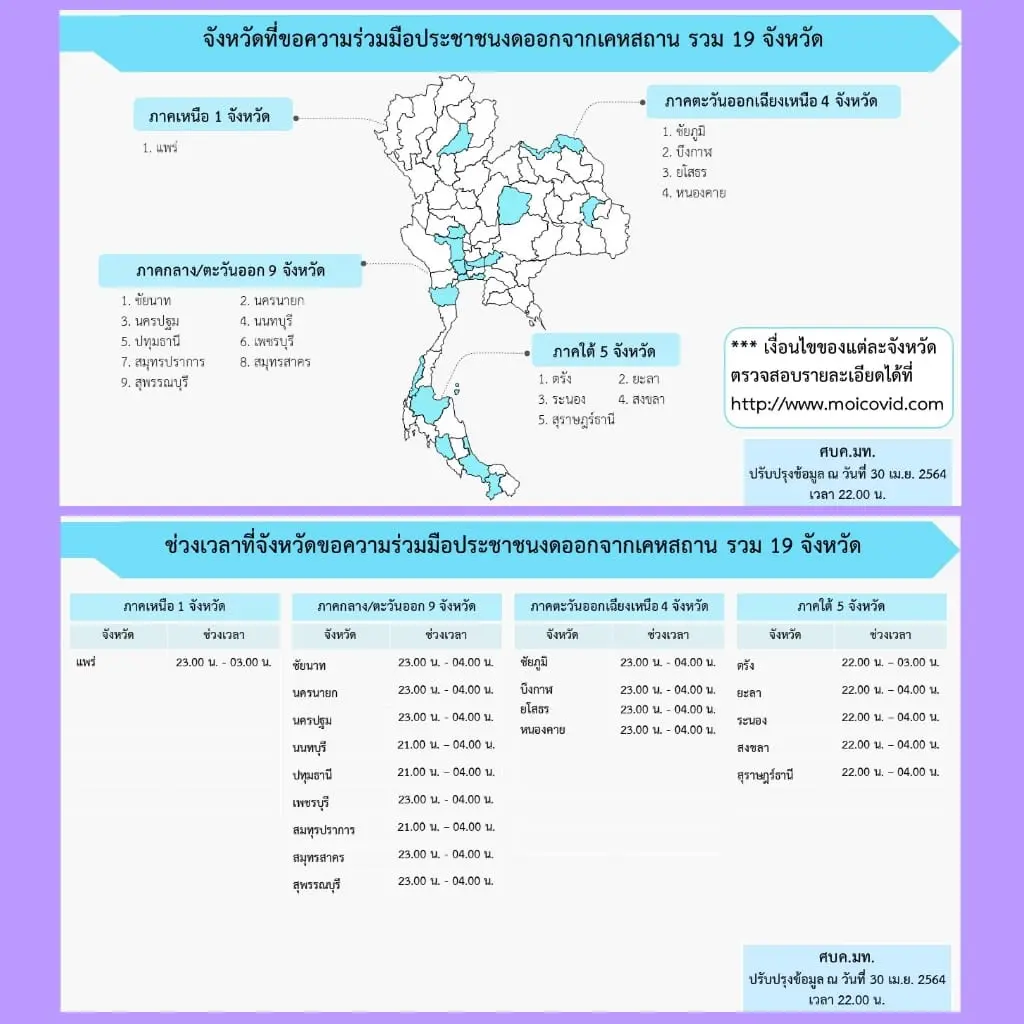 งดออกจากบ้าน —- เฟสบุ๊กเพจ กระทรวงมหาดไทย PR ได้แจ้งรายชื่อจังหวัดที่ขอความร่วมมือประชาชนงดออกจากเคหสถาน อัพเดตข้อมูลล่าสุด 30 เมษายน 2564 เวลา 22.00 น. รวมทั้งสิ้น 19 จังหวัด ดังนี้