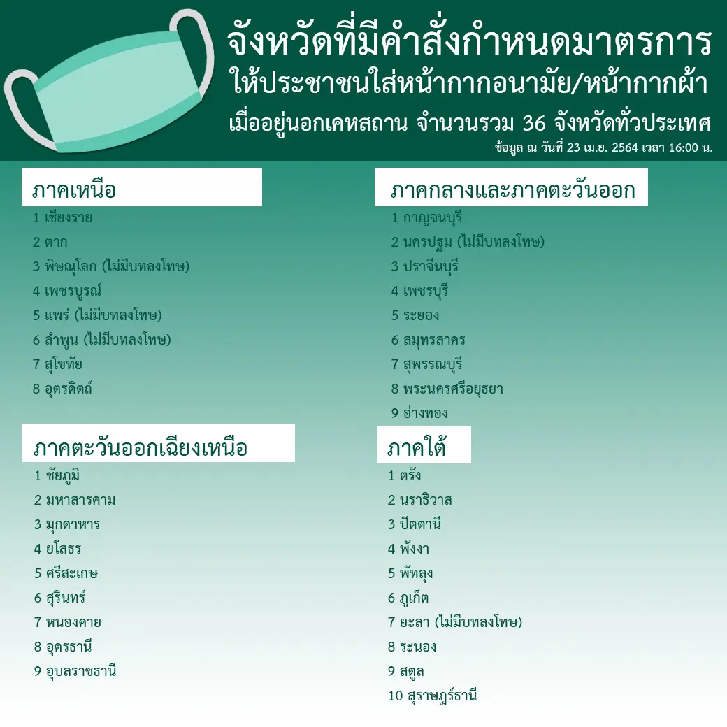 จังหวัดที่ต้องใส่หน้ากาก — เมื่อวันที่ 23 เม.ย.64 เฟสบุ๊ก กระทรวงมหาดไทย PR ได้เปิดเผยรายชื่อจังหวัดที่มีคำสั่งกำหนดมาตรการให้ประชาชนใส่หน้ากากอนามัย/หน้ากากผ้า เมื่ออยู่นอกเคหสถาน จำนวนรวม 36 จังหวัดทั่วประเทศ โดยรายชื่อดังกล่าวได้มีการอัพเดทเมื่อวันที่ 23 เม.ย. 2564 เวลา 16:00 น. ซึ่งมีรายชื่อจังหวัดดังต่อไปนี้
