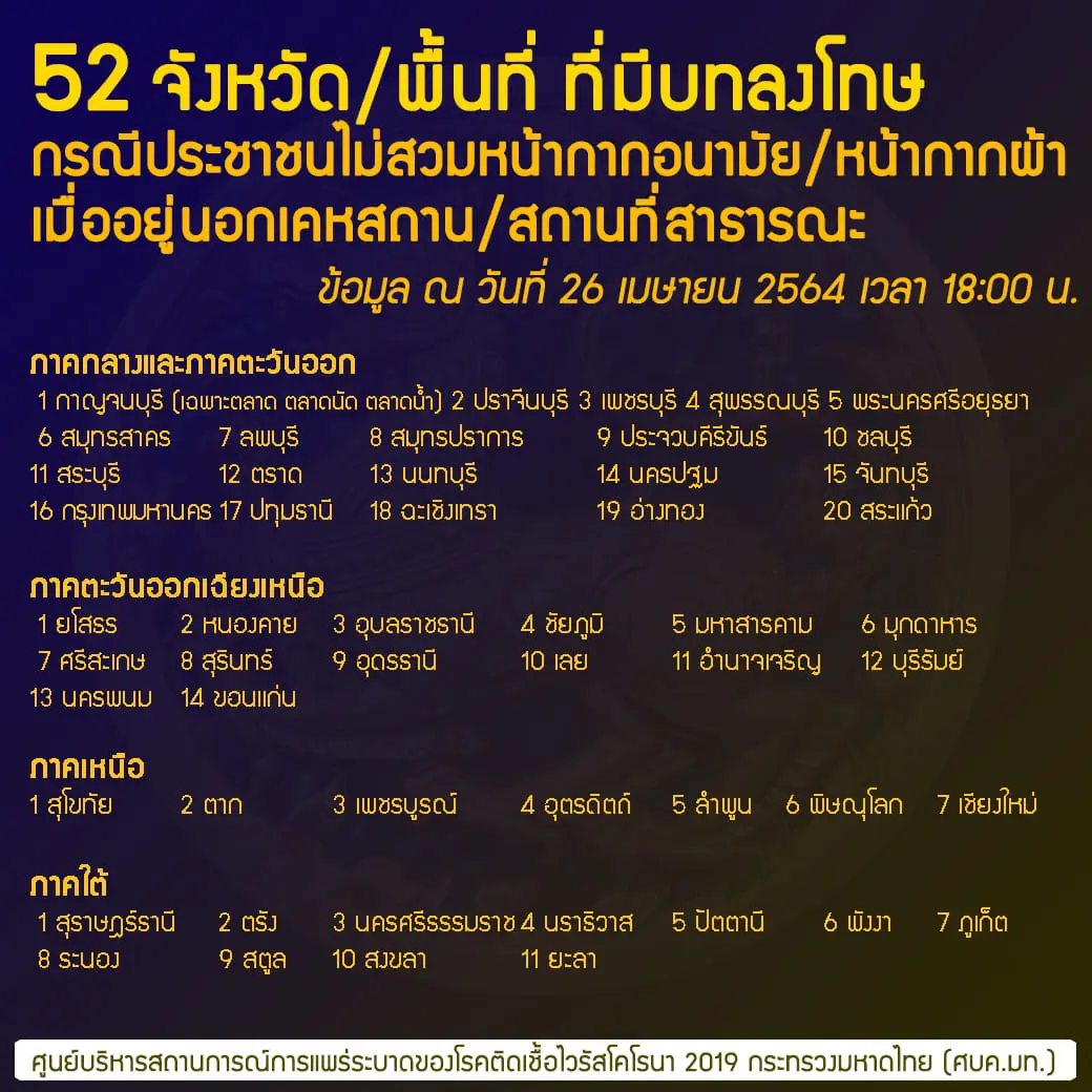 หน้ากากอนามัย —- เมื่อวันที่ 26 เม.ย.64 เฟสบุ๊ก กระทรวงมหาดไทย PR ได้เปิดเผยรายชื่อจังหวัดที่มีคำสั่งกำหนดมาตรการให้ประชาชนใส่หน้ากากอนามัย/หน้ากากผ้า เมื่ออยู่นอกเคหสถาน จำนวนรวม 52 จังหวัด/พื้นที่ (51 จังหวัด + กทม.) โดยรายชื่อดังกล่าวได้มีการอัพเดทเมื่อวันที่ 26 เม.ย. 2564 เวลา 18.00 น. ซึ่งมีรายชื่อจังหวัดดังต่อไปนี้