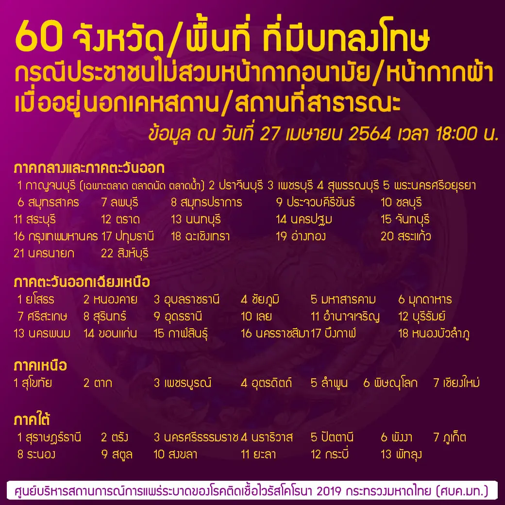 หน้ากากอนามัย — เมื่อวันที่ 27 เม.ย.64 เฟสบุ๊ก กระทรวงมหาดไทย PR ได้เปิดเผยรายชื่อจังหวัด ที่มีบทลงโทษ กรณีประชาชนไม่ใส่หน้ากากอนามัย/หน้ากากผ้า เมื่ออยู่นอกเคหสถาน/สถานที่สาธารณะ จำนวนรวม 60 จังหวัด/พื้นที่ 59 จังหวัด + กทม.) โดยรายชื่อดังกล่าวได้เพิ่มเพิ่ม จังหวัดนครราชสีมา บึงกาฬ สิงห์บุรี และหนองบัวลำภู และมีการอัพเดทเมื่อวันที่ 27 เม.ย. 2564 เวลา 18.00 น. ซึ่งมีรายชื่อจังหวัดดังต่อไปนี้