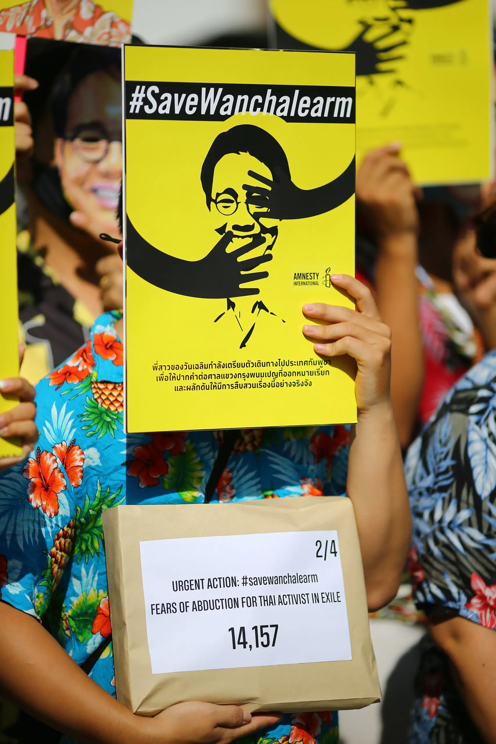 วันเฉลิม กลุ่มเพื่อนวันเฉลิมและนักกิจกรรมแอมเนสตี้ อินเตอร์เนชั่นแนล ประเทศไทยเดินทางไปยังสถานทูตกัมพูชาประจำประเทศไทย เพื่อจัดกิจกรรมเนื่องในโอกาสครบรอบ 6 เดือนการหายตัวไปของวันเฉลิม และร่วมยื่น 14,157 รายชื่อจากผู้สนับสนุนที่ส่งข้อเรียกร้องถึงทางการกัมพูชาให้มีการสืบสวนเรื่องนี้อย่างมีประสิทธิภาพ เร่งด่วน รอบด้าน และโปร่งใสและคืนความยุติธรรมให้กับครอบครัว นายวันเฉลิม สัตย์ศักดิ์สิทธิ์
