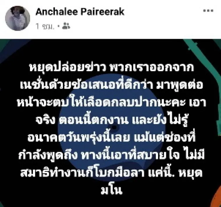 “หยุดปล่อยข่าว พวกเราออกจากเนชั่นด้วยข้อเสนอที่ดีกว่า มาพูดต่อหน้าจะตบให้เลือดกลบปากนะคะ เอาจริง ตอนนี้ตกงาน และยังไม่รู้อนาคตวันพรุ่งนี้เลย แม้แต่ช่องที่กำลังพูดถึง ทางนี้เอาที่สบายใจ ไม่มีสมาธิทำงานก็โบกมือลา แค่นี้ หยุดมโน”
