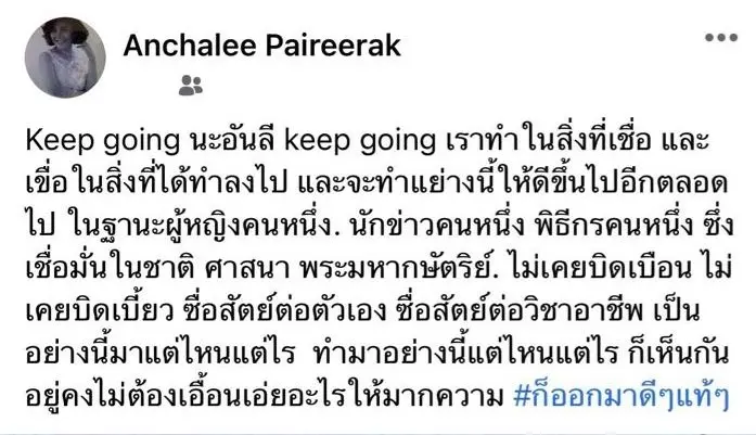 ล่าสุด น.ส.อัญชะลี ไพรีรัก ผู้ประกาศข่าวชื่อดัง ที่เพิ่งลาออกจากเนชั่นทีวีได้โพสต์ข้อความผ่านทางเฟสบุ๊กระบุว่า Keep Going นะอันลี keep going เราทำในสิ่งที่เชื่อ และเชื่อในสิ่งที่ได้ทำลงไป และจะทำอย่างนี้ให้ดีขึ้นไปอีกตลอดไป ในฐานะผู้หญิงคนหนึ่ง นักข่าวคนหนึ่ง พิธีกรคนหนึ่ง ซึ่งเชื่อมั่นในชาติ ศาสนา พระมหากษัตริย์ ไม่เคยบิดเบือน ไม่เคยบิดเบี้ยว ซื่อสัตย์ต่อตัวเอง ซื่อสัตย์ต่อวิชาชีพ เป็นอย่างนี้มาแต่ไหนแต่ไร ทำอย่างนี้แต่ไหนแต่ไร ก็เห็นกันอยู่คงไม่ต้องเอื้อนเอ่ยอะไรให้มากความ ก็ออกมาดีๆ แท้ๆ”
