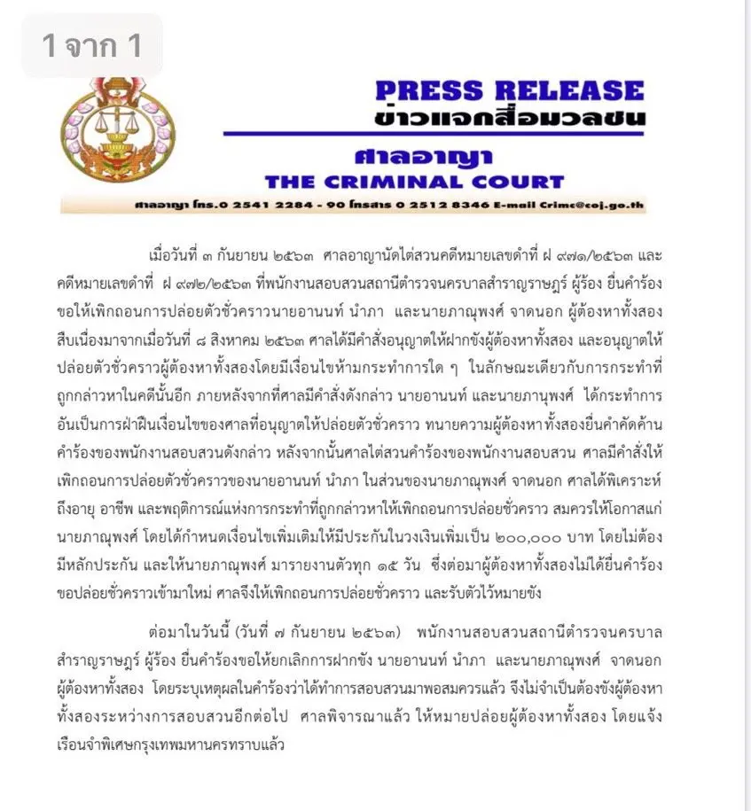 กรณี เมื่อวันที่ 3 กันยายน 2563 ศาลอาญานัดไต่สวนคดีหมายเลขดำ ที่ ฝ ๙๗๑/๒๕๖๓ และ คดีหมายเลขดำที่ ฝ ๙๗๒/๒๕๖๓ ที่พนักงานสอบสวนสถานีตำรวจนครบาลสำราญราษฎร์ผู้ร้อง ยื่นคำร้องขอให้เพิกถอนการปล่อยตัวชั่วคราว นายอานนท์ นำภา และ นายภาณุพงศ์ จาดนอก ผู้ต้องหาทั้งสอง