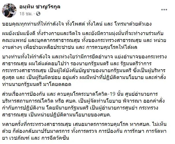 27 เม.ย. 64 นายอนุทิน ชาญวีรกูล รองนายกรัฐมนตรี และรัฐมนตรีว่าการกระทรวงสาธารณสุข โพสต์ข้อความผ่านเฟซบุ๊กส่วนตัว “อนุทิน ชาญวีรกูล” ระบุข้อความว่า ขอบคุณทุกท่านที่ให้กำลังใจ ทั้งโพสต์ ทั้งไลน์ และ โทรมาด้วยตัวเอง