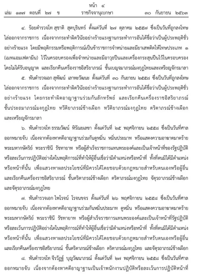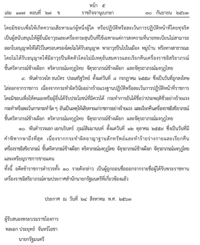 ราชกิจจานุเบกษา โปรดเกล้าฯ ถอดยศ 1 ทหาร 3 ตำรวจประพฤติชั่ว-ผิดวินัยร้ายแรง