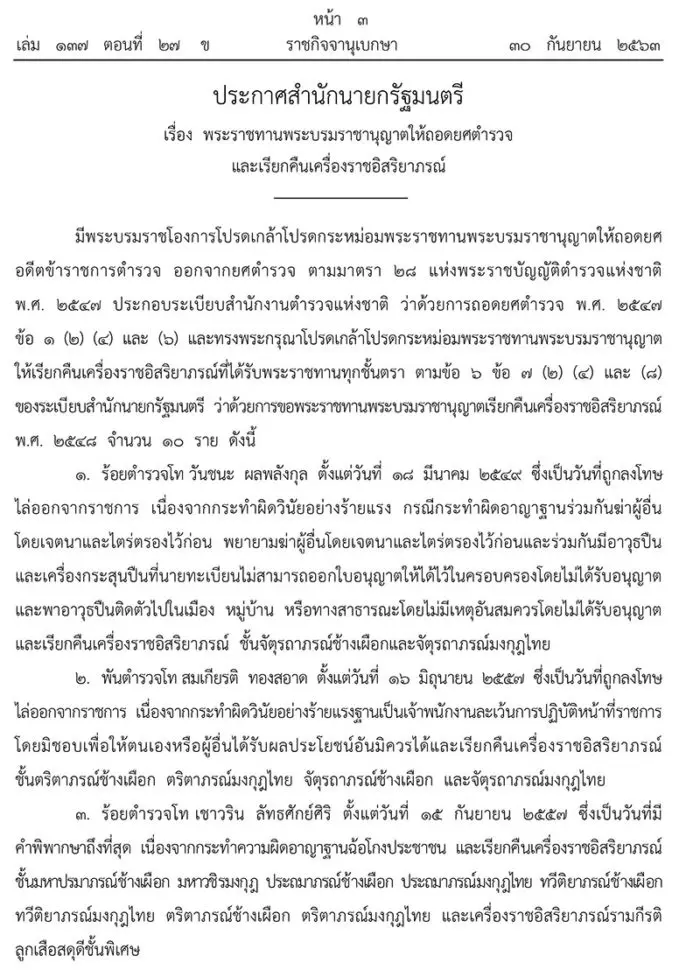 ถอดยศตำรวจ — กิจจานุเบกษาเผยแพร่ประกาศสํานักนายกรัฐมนตรีเรื่อง พระราชทานพระบรมราชานุญาตให้ถอดยศตํารวจและเรียกคืนเครื่องราชอิสริยาภรณ์ โดยระบุว่า มีพระบรมราชโองการโปรดเกล้าโปรดกระหม่อมพระราชทานพระบรมราชานุญาตให้ถอดยศอดีตข้าราชการตํารวจ ออกจากยศตํารวจ ตามมาตรา 28 แห่งพระราชบัญญัติตํารวจแห่งชาติ พ.ศ.2547 ประกอบระเบียบสํานักงานตํารวจแห่งชาติ ว่าด้วยการถอดยศตํารวจ พ.ศ.2547 ข้อ 1 (2) (4) และ (6) และทรงพระกรุณาโปรดเกล้าโปรดกระหม่อมพระราชทานพระบรมราชานุญาตให้เรียกคืนเครื่องราชอิสริยาภรณ์ที่ได้รับพระราชทานทุกชั้นตรา ตามข้อ 6 ข้อ 7 (2) (4) และ (8) ของระเบียบสํานักนายกรัฐมนตรี ว่าด้วยการขอพระราชทานพระบรมราชานุญาตเรียกคืนเครื่องราชอิสริยาภรณ์ พ.ศ. 2548 จํานวน 10 ราย ดังนี้
