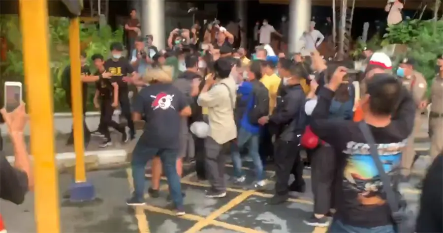ม็อบ21ตุลา ผู้สื่อข่าวรายงานว่า ที่มหาวิทยาลัย รามคำแหง บริเวณลานพ่อขุน กลุ่มปกป้องสถาบัน ที่ออกมาแสดงจุดยืน พร้อมใจกันสวมเสื้อเหลือง ได้เกิดปะทะกับกลุ่มผู้ชุมนุมคณะราษฏร กันอย่างชุลมุน ทำให้เจ้าหน้าที่ตำรวจ ต้องรีบเข้าระงับเหตุอย่างเร่งด่วน ก่อนทั้งสองฝ่ายจะแยกย้ายกันไป