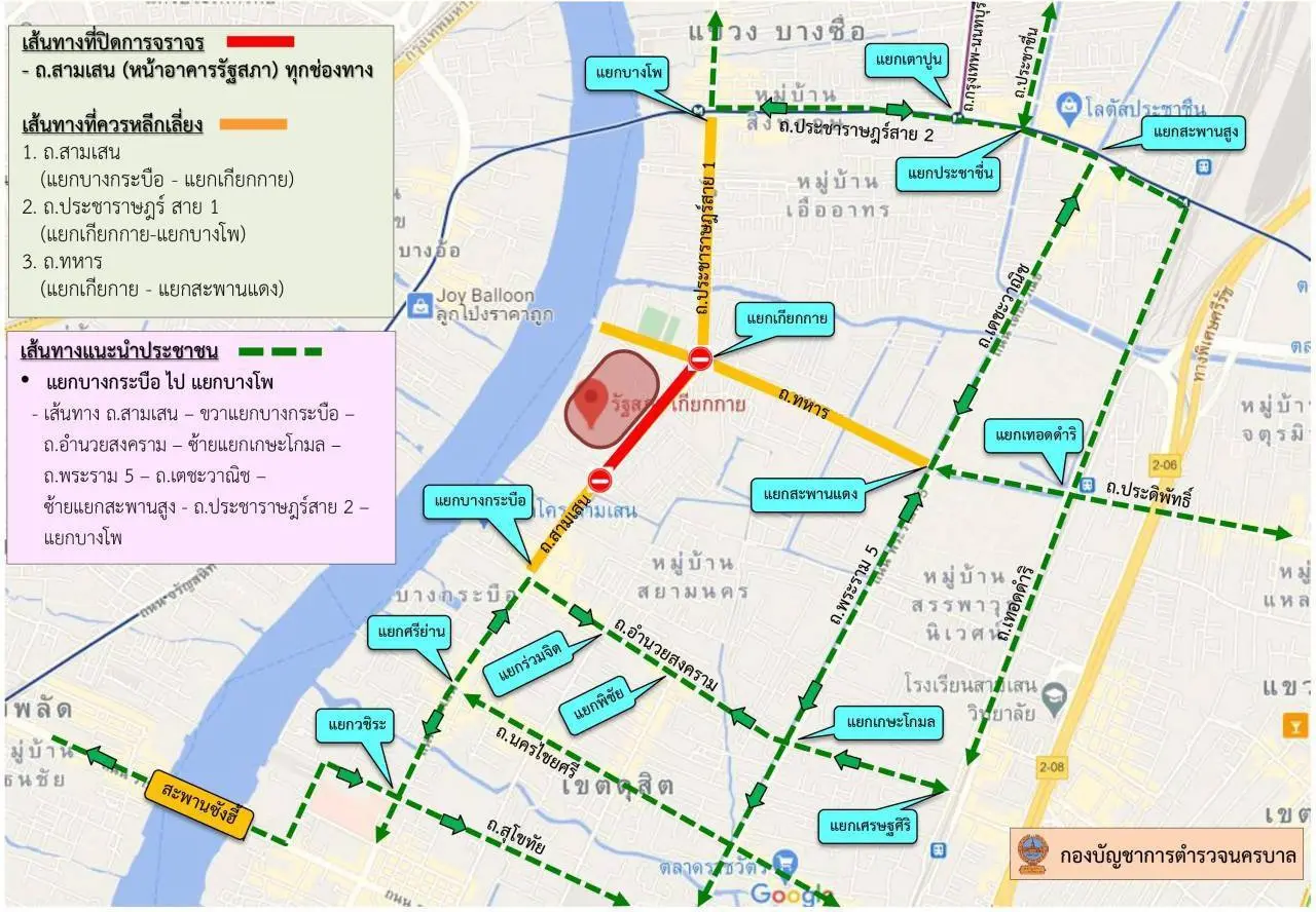 บช.น. จึงขอแจ้งข้อมูลข่าวสารด้านการจราจร โดยขอให้หลีกเลี่ยงเส้นทางตั้งแต่เวลา 12.00 น. เป็นต้นไปจนเสร็จสิ้นการชุมนุม ดังนี้