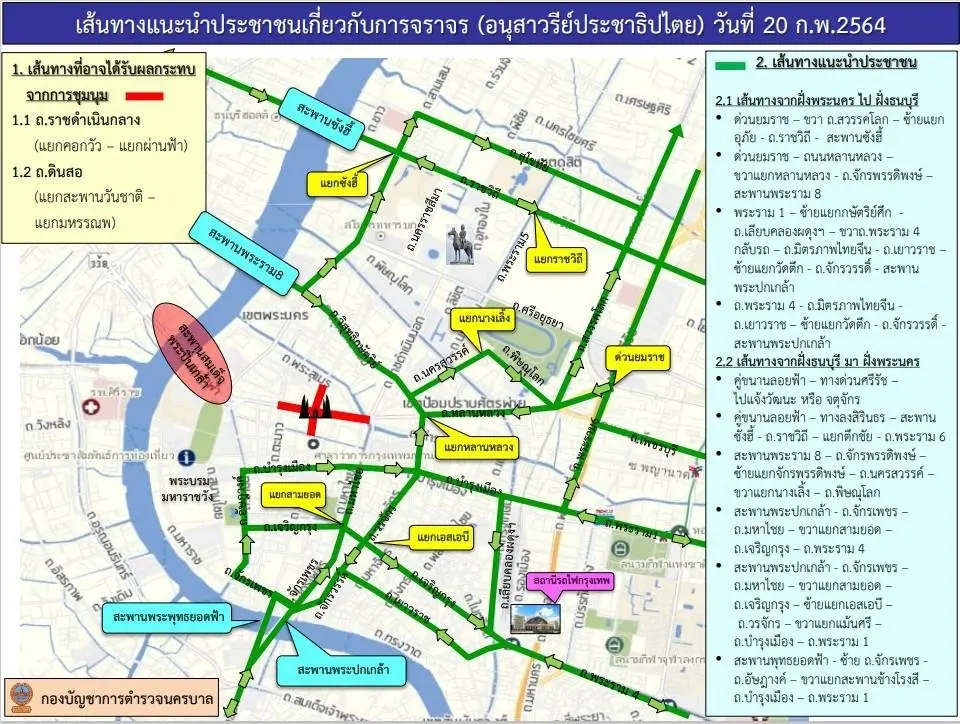 จากกรณีที่ปรากฎทางสื่อโซเชียลมีเดีย ได้มีประกาศนัดรวมตัวของกลุ่มผู้ชุมนุม ม็อบ 20 กุมภา บริเวณอนุสาวรีย์ประชาธิปไตย ในวันที่ 20 ก.พ.64 โดยพื้นที่การนัดหมายชุมนุมฯ อยู่บริเวณถนนราชดำเนิน เป็นเส้นทางสายหลัก ที่ประชาชนใช้ในการสัญจรไปมาระหว่างฝั่งพระนคร และฝั่งธนบุรี ดังนั้นเพื่อให้เกิดความสะดวกในการเดินทางของพี่น้องประชาชน