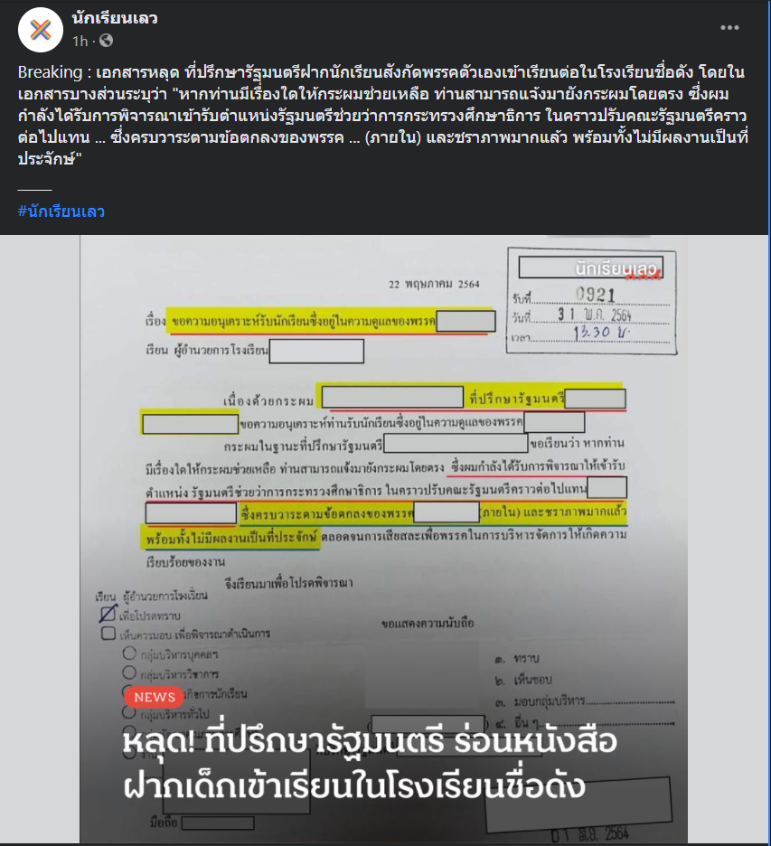 เมื่อวันที่ 11 มิ.ย.64 เฟซบุ๊ก นักเรียนเลว ได้เปิดเผยเอกสารราชการ ถึงผู้อำนวยการโรงเรียนแห่งหนึ่ง เพื่อขอความอนุเคราะห์รับนักเรียน ซึ่งอยู่ในความดูแลของพรรคการเมืองแห่งหนึ่ง ลงวันที่ 22 พฤษภาคม 2564 โดยภายในจดหมายมีข้อความระบุว่า