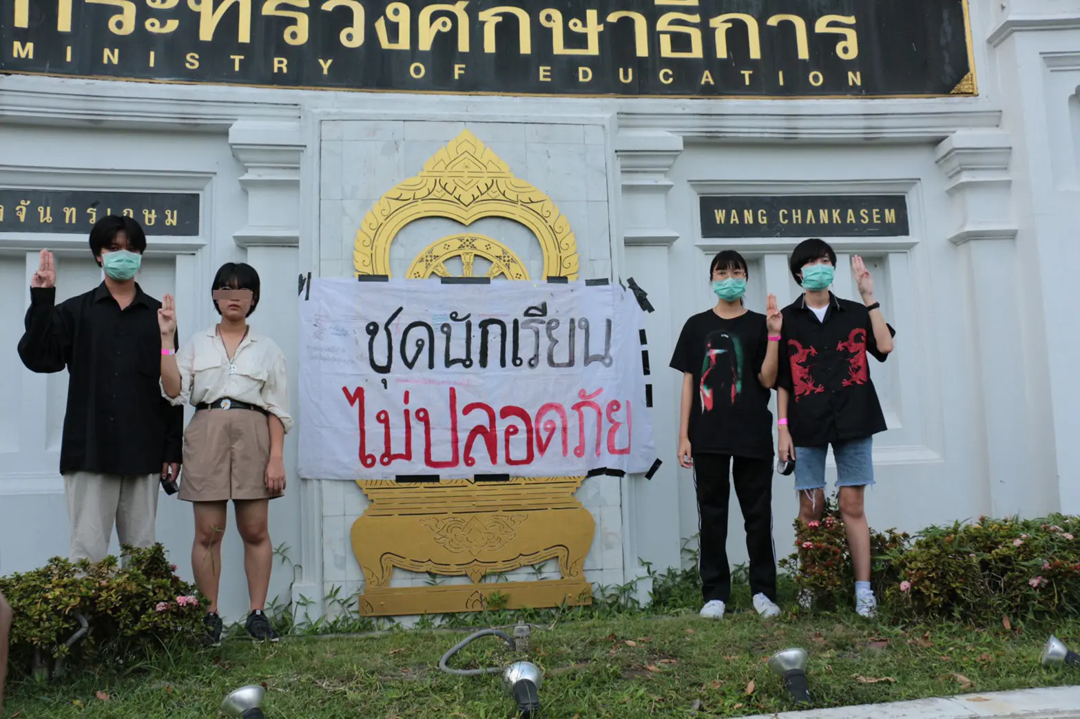 เมื่อเวลา 17.00 น. กลุ่ม นักเรียนเลว ได้จัดการปราศรัยบริเวณหน้ากระทรวงศึกษาธิการ พร้อมกับร่วมทำกิจกรรมนำชุดนักเรียนมาแขวนที่บริเวณประตูทางเข้าออกของกระทรวงศึกษาธิการ เพื่อเรียกร้องให้ยกเลิกการบังคับให้ใส่เครื่องแบบนักเรียน พร้อมนำป้ายข้อความ “ชุดนักเรียนไม่ปลอดภัย” และใส่ชุดไปรเวท ยืนชู 3 นิ้วด้วย
