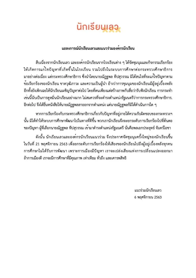 วันที่ 6 พ.ย.2563 ที่อนุสาวรีย์ประชาธิปไตย กลุ่ม นักเรียนเลว ได้เผยแพร่แถลงการณ์นักเรียนเลวและแนวร่วมองค์กรนักเรียน ระบุว่า สืบเนื่องจากนักเรียนเลว และองค์กรนักเรียนจากโรงเรียนต่าง ๆ ได้จัดชุมนุมและกิจกรรมเรียกร้องให้เกิดการแก้ไขปัญหาที่เกิดขึ้นในโรงเรียน รวมไปถึงในระบบการศึกษาต่อกระทรวงศึกษาธิการมาอย่างต่อเนื่อง