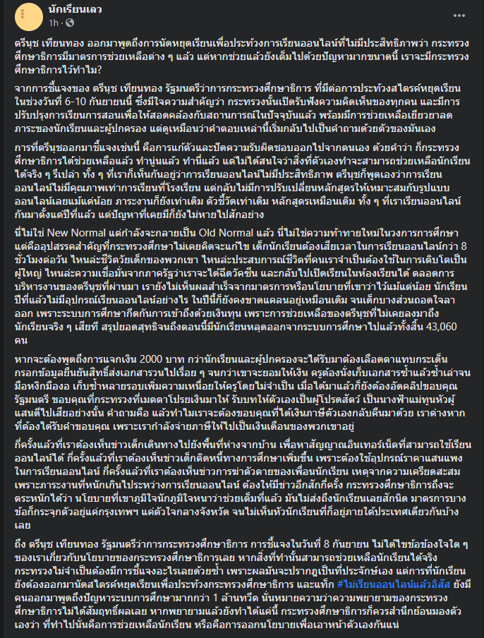 แต่ไม่ได้สนใจว่าสิ่งที่ตัวเองทำ สามารถช่วยเหลือนักเรียนได้จริงรึเปล่า ทั้ง ๆ ที่เราก็เห็นกันอยู่ว่าการเรียนออนไลน์ไม่มีประสิทธิภาพ ตรีนุชก็พูดเองว่าการเรียนออนไลน์ไม่มีคุณภาพเท่าการเรียนที่โรงเรียน แต่กลับไม่มีการปรับเปลี่ยนหลักสูตรให้เหมาะสมกับรูปแบบออนไลน์เลยแม้แต่น้อย