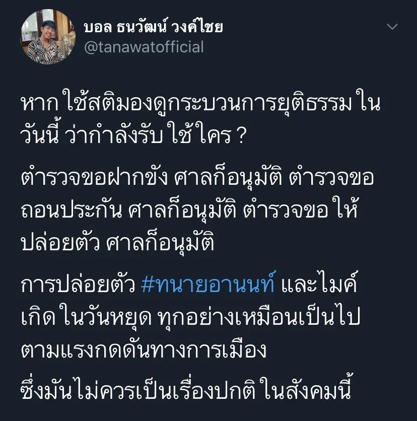บอล ธนวัฒน์ วงศ์ไชย นักเคลื่อนไหวทางการเมือง โพสต์ข้อความผ่านทวิตเตอร์ถึงกรณีดังกล่าว ระบุว่า หากใช้สติมองดูกระบวนการยุติธรรมในวันนี้ ว่ากำลังรับใช้ใคร ? ตำรวจขอฝากขัง ศาลก็อนุมัติ ตำรวจขอถอนประกัน ศาลก็อนุมัติ ตำรวจขอให้ปล่อยตัว ศาลก็อนุมัติ การปล่อยตัว #ทนายอานนท์ และไมค์ เกิดในวันหยุด ทุกอย่างเหมือนเป็นไปตามแรงกดดันทางการเมือง ซึ่งมันไม่ควรเป็นเรื่องปกติในสังคมนี้