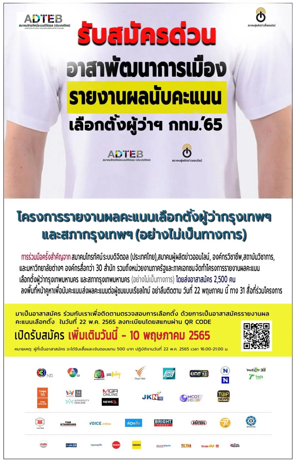 องค์กรสื่อกว่า 30 องค์กร เชิญชวนชาวกทม. ร่วมเป็นส่วนหนึ่งรายงานผลเลือกตั้ง เปิดรับอาสาสมัคร นับผลคะแนนเลือกตั้งผู้ว่าฯ กทม.