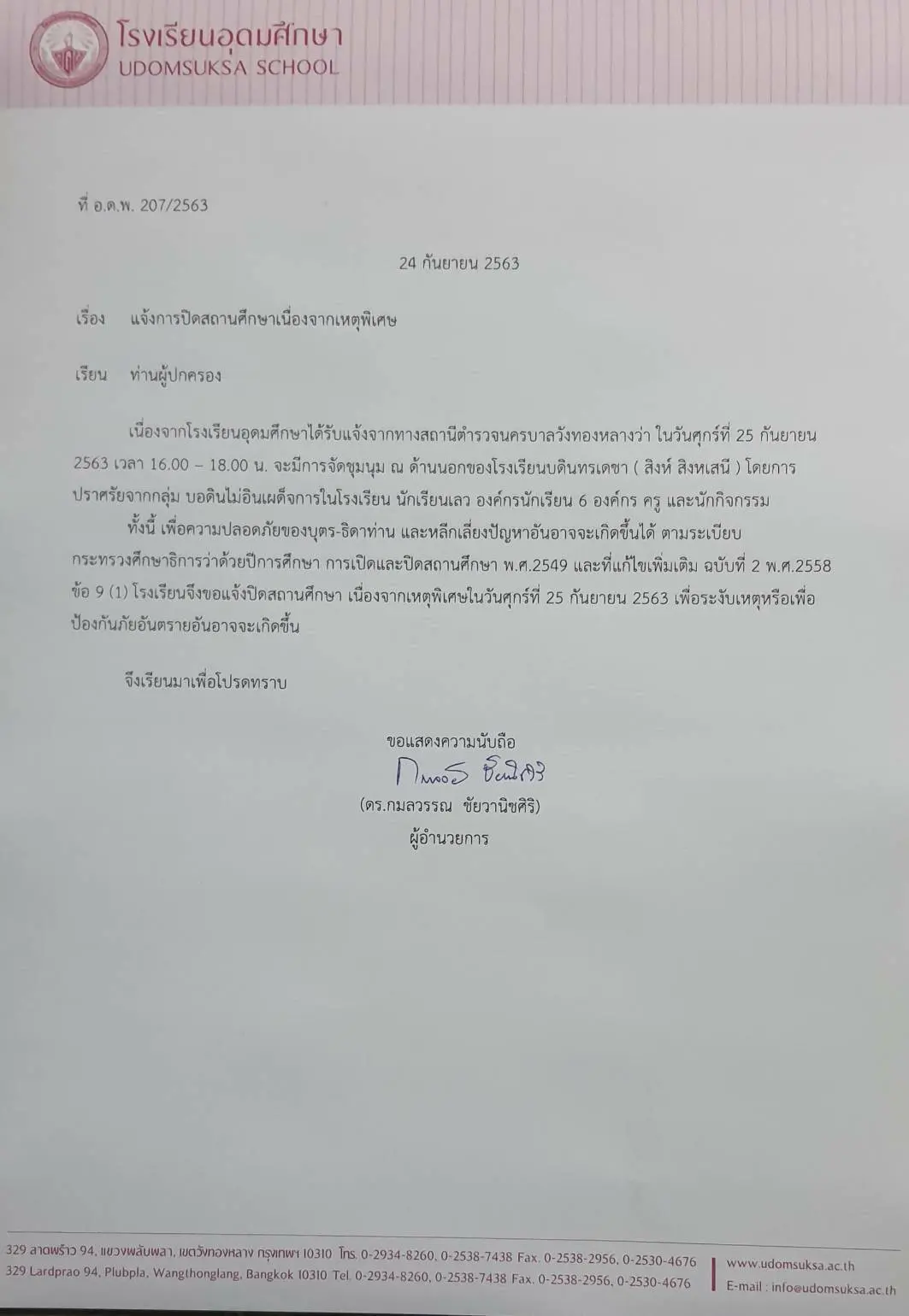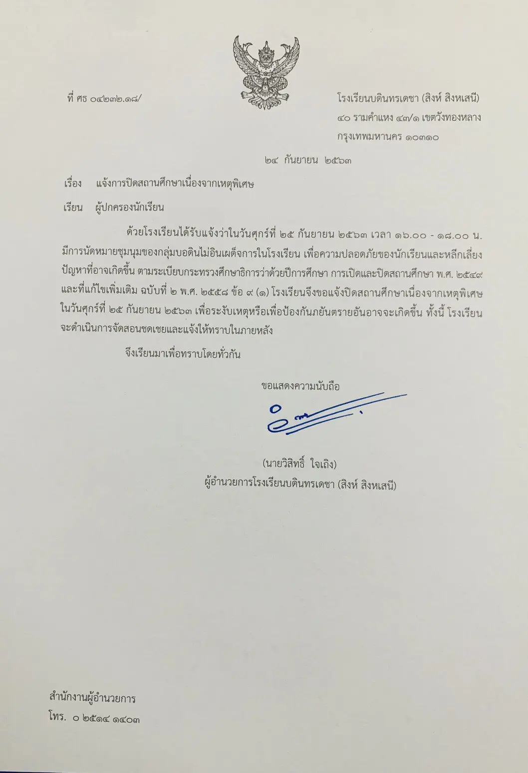 ราชินีบน ประกาศหยุดเรียน 24 ก.ย. เลี่ยงการชุมนุมหน้ารัฐสภา พร้อมแนะเส้นทางควรหลีกเลี่ยง
