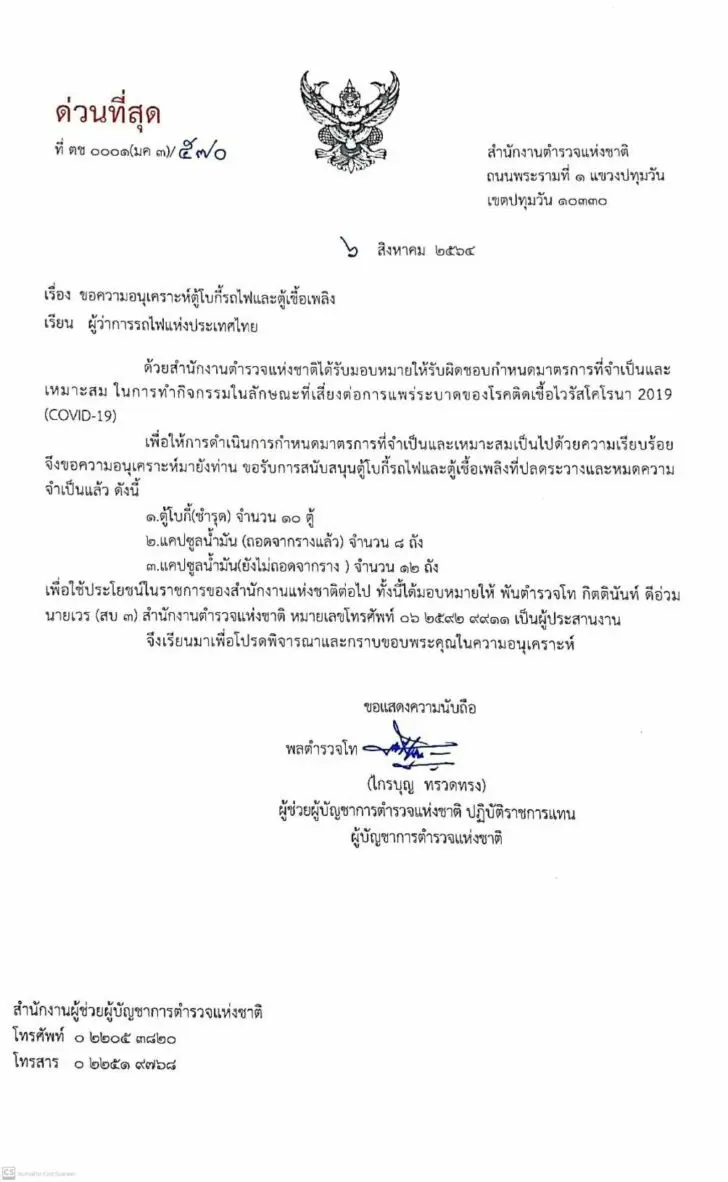 ด้วยสำนักงานตำรวจแห่งชาติ ได้รับมอบหมายให้รับผิดชอบ กำหนดมาตรการที่จำเป็นและเหมาะสมในการทำกิจกรรม ในลักษณะที่เสี่ยงต่อการแพร่ระบาดของโรคติดเชื้อไวรัสโคโรนา 2019 (COVID-19) เพื่อให้การดำเนินการกำหนดมาตรการที่จำเป็นและเหมาะสมเป็นไปด้วยความเรียบร้อย จึงขอความอนุเคราะห์มายังท่าน ขอรับการสนับสนุนตู้โบกี้รถไฟและตู้เชื้อเพลิงที่ปลดระวางและหมดความจำเป็นแล้ว ดังนี้