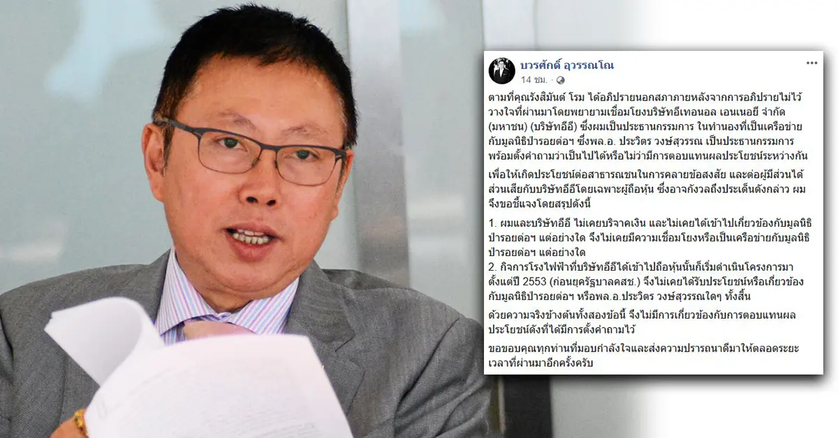 ตามที่คุณรังสิมันต์ โรม ได้อภิปรายนอกสภาภายหลังจากการอภิปรายไม่ไว้วางใจที่ผ่านมาโดยพยายามเชื่อมโยงบริษัทอีเทอนอล เอนเนอยี จำกัด (มหาชน) (บริษัทอีอี) ซึ่งผมเป็นประธานกรรมการ ในทำนองที่เป็นเครือข่ายกับมูลนิธิป่ารอยต่อฯ ซึ่งพล.อ. ประวิตร วงษ์สุวรรณ เป็นประธานกรรมการพร้อมตั้งคำถามว่าเป็นไปได้หรือไม่ว่ามีการตอบแทนผลประโยชน์ระหว่างกัน