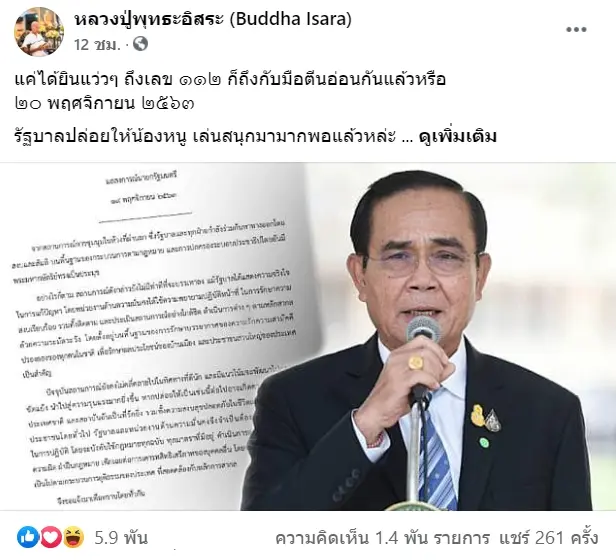 ม็อบ21พฤศจิกา พุทธะอิสระ อดีตเจ้าอาวาสวัดอ้อน้อย จังหวัดนครปฐม โพสต์ข้อความผ่านเฟซบุ๊ก ระบุว่า แค่ได้ยินแว่ว ๆ ถึงเลข 112 ก็ถึงกับมือตีนอ่อนกันแล้วหรือ รัฐบาลปล่อยให้น้องหนู เล่นสนุกมามากพอแล้วหล่ะ บางที เล่นจนเลยเถิด ลามปาม ถึงขนาดคิดจะขุดรากเหง้า ของบรรพบุรุษไทย ไม่เว้นแม้แต่องค์พระประมุขของชาติ ยังถูกเด็ก ๆ ขี้เล่น ที่ไม่รู้จักที่ต่ำที่สูง ดึงพระองค์มาจาบจ้วง ด้อยค่า อย่างสนุกคะนอง